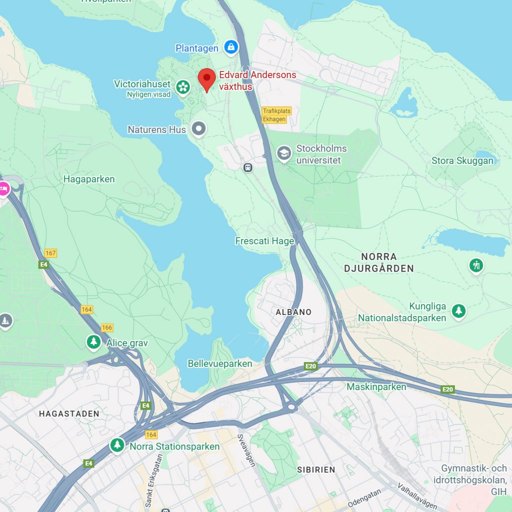 Edvard Andersons växthus ligger i Bergianska trädgården mitt emot Naturhistoriska riksmuseet, mellan Norrtäljevägen och Brunnsvikens östra strand. Här upplever vi Medelhavsområdet, Sydafrika, sydvästra Australien, Kalifornien och tropikerna.