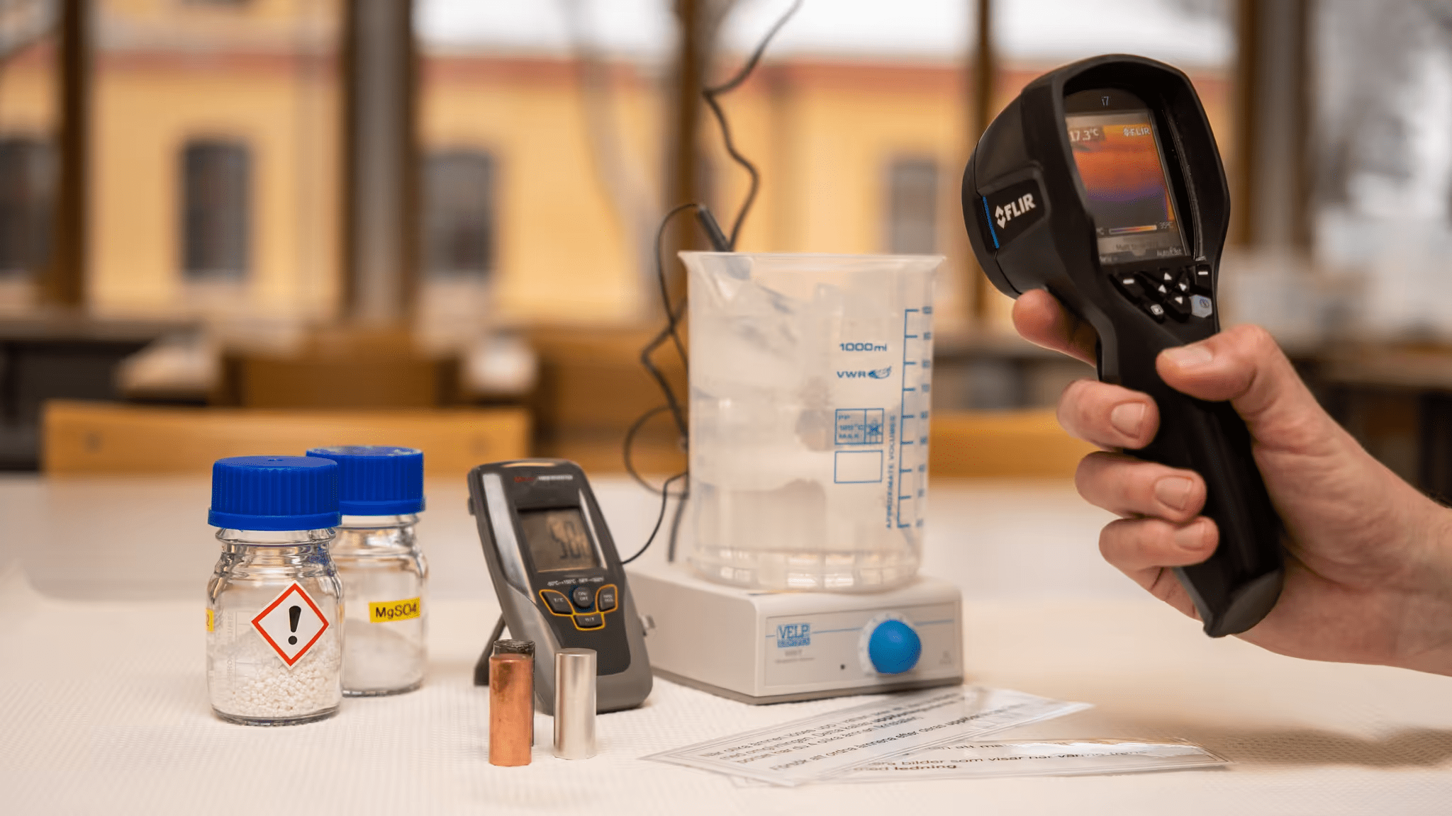 I den här laborationen undersöker vi hur energi kan bildas, omvandlas och transporteras mellan olika material? Fokuset är delat mellan termodynamiska begrepp inom kemin och fysiken.
