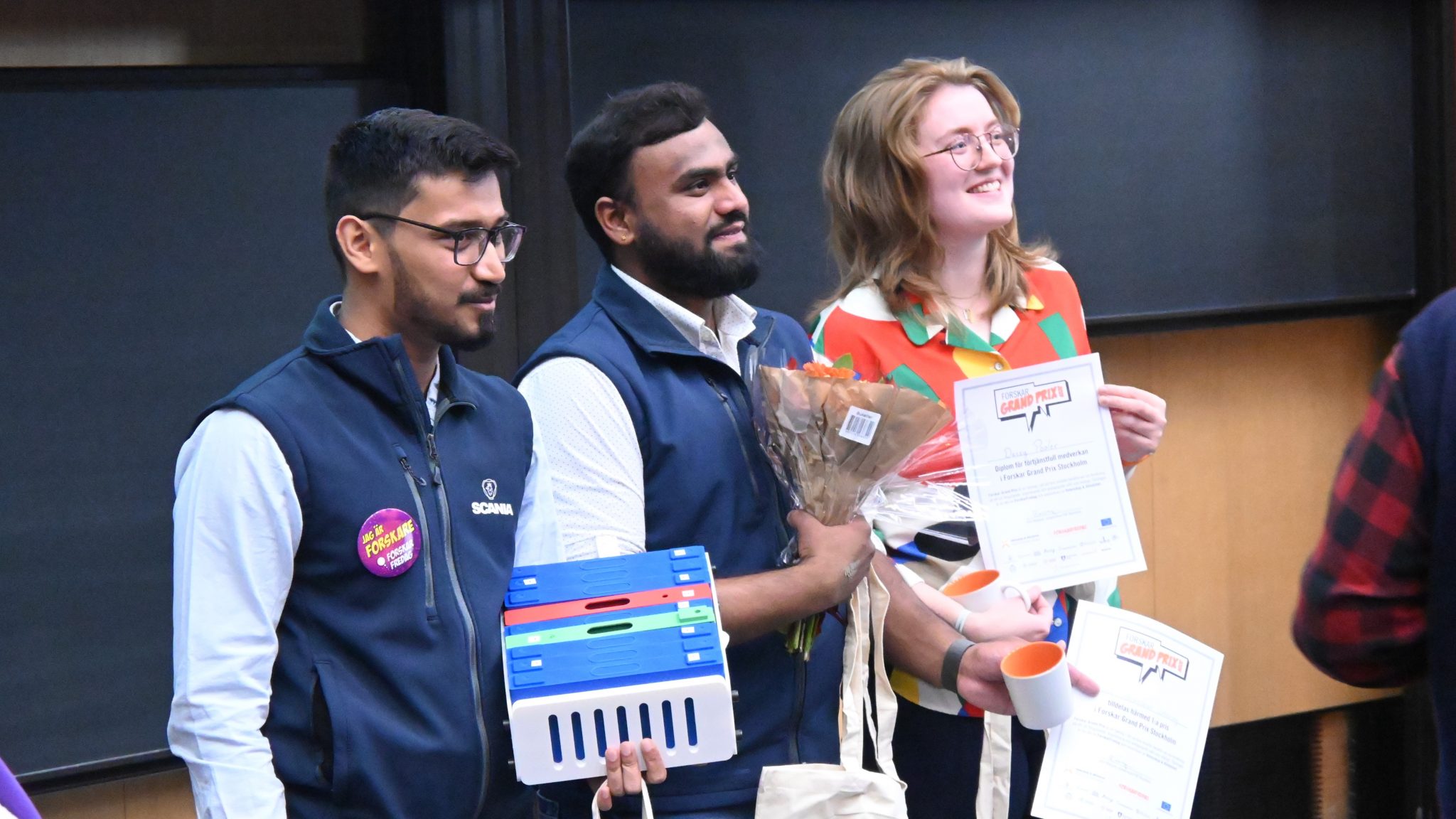 Pristagarna under Forskar Grand Prix 2025 i Stockholm, Aamer Siddiqu, KTH/Scania, Shenoy Vivek Venkatesh, KTH/ Scania (1:a pris), Daisy Pooler, KTH